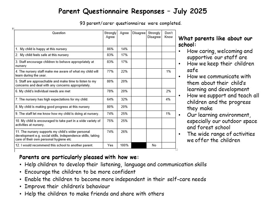 "I like the welcoming approachable teachers and team, the variety of learning opportunities, forest school and the emotional support given by keyworker." Kayleigh 2024